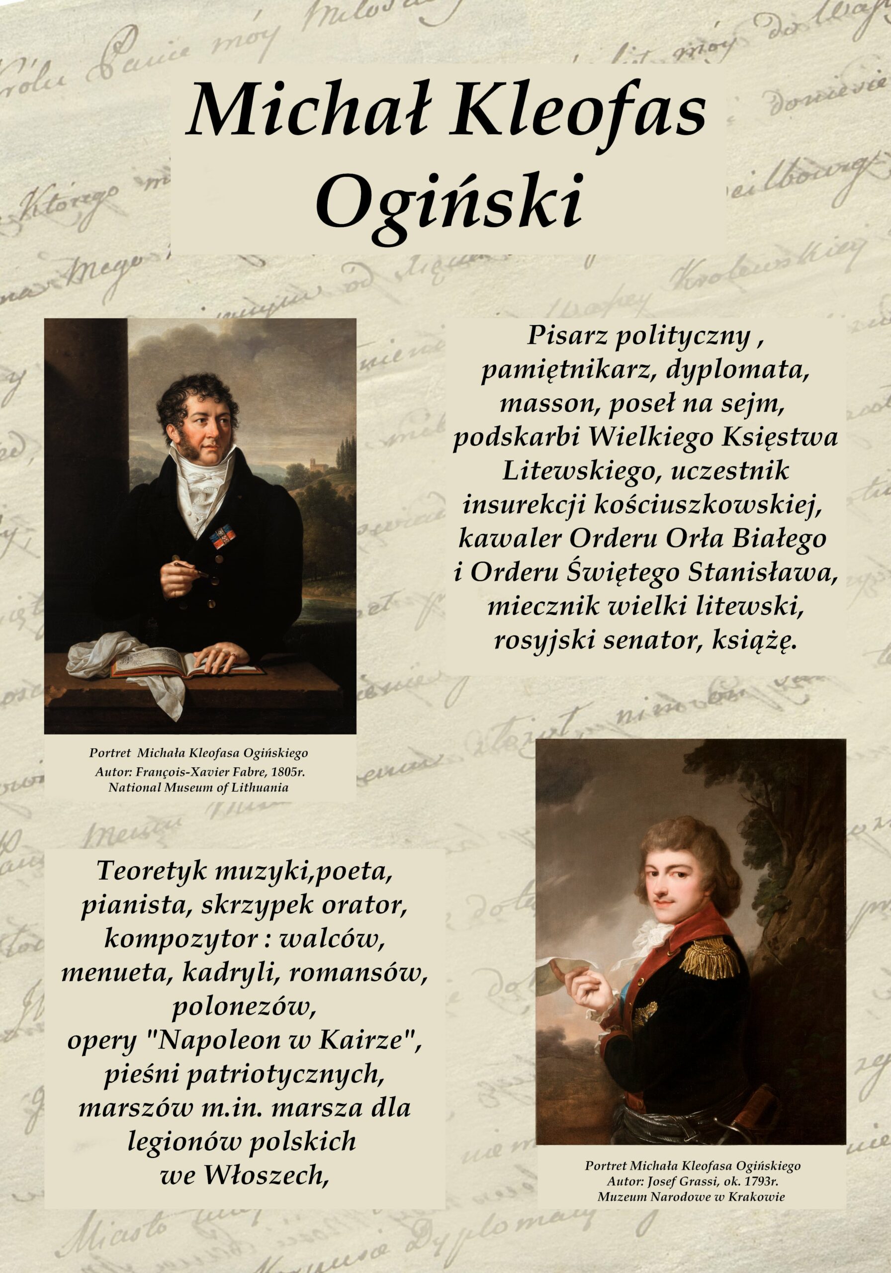 Serdecznie zapraszamy na wystawę poświęconą życiu i twórczości Michała Kleofasa Ogińskiego, który był nie tylko kompozytorem (autorem słynnego poloneza „Pożegnanie Ojczyzny”), ale także działaczem politycznym i dyplomatą Rzeczypospolitej Obojga Narodów. Wystawa powstała w ramach projektu kulturalno-edukacyjnego Stowarzyszenia Zespół Folkowy Wiskitczanki przy współpracy Muzeum Mazowsza Zachodniego w Żyrardowie. Plansze ekspozycji przedstawiają bogatą biografię księcia, ze szczególnym uwzględnieniem jego związku z regionem żyrardowskim.